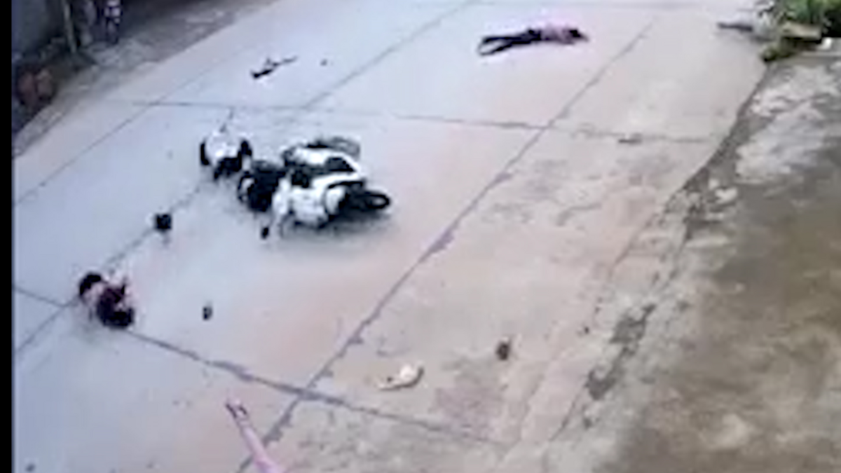 Hai nam thanh niên đầu không đội mũ bảo hiểm, điều khiển xe máy với tốc độ cao đã đâm trúng 2 em nhỏ đạp xe qua đường khiến 4 người nằm bất động tại hiện trường.