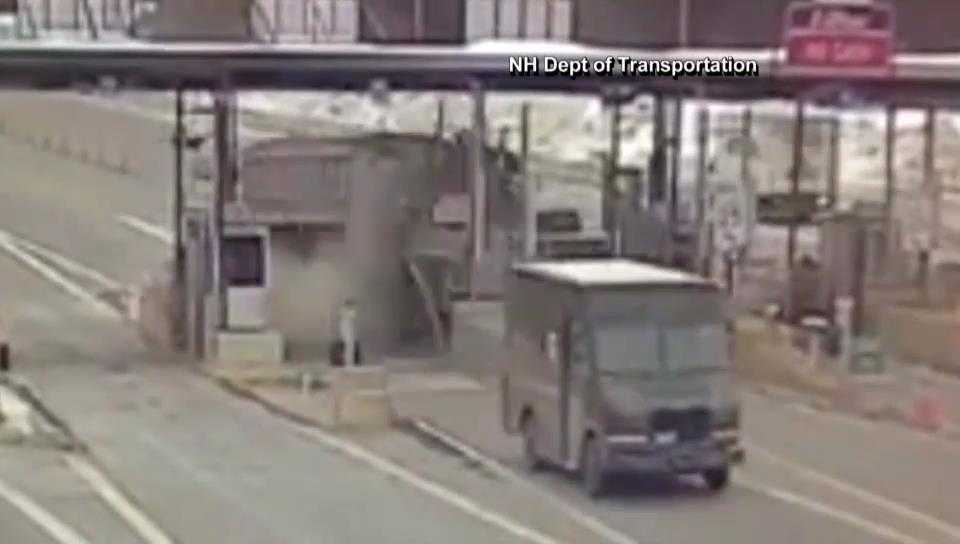 Camera an ninh ghi lại cảnh một chiếc xe tải phóng với tốc độ nhanh đâm vỡ vụ một trạm thu phí trên đường.