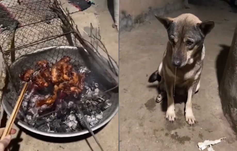 Vẻ mặt thèm thuồng, nước dãi chảy thành dòng của chú chó khi nhìn chủ nướng thịt khiến cho dân mạng vừa thấy thương vừa buồn cười.