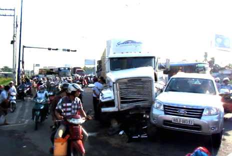 Tại Q.Thủ Đức, TP.HCM, 11 chiếc ô tô, xe máy đã bị "hung thần" container tông trực diện gây hư hỏng nặng, vụ tai nạn xảy ra khiến 7 người bị thương phải nhập viện cấp cứu.