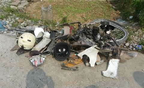 Cú đâm mạnh đã khiến chiếc xe máy bị nghiền nát vụn, các bộ phận bắn ra tứ phía. Trong khi đó, 2 người đàn ông ngồi trên chiếc xe này cũng bị văng ra ngoài và bị thương nặng.
