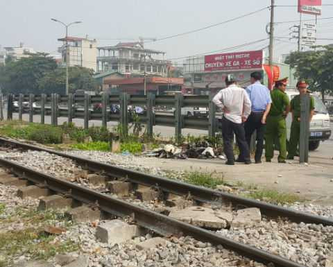 Đúng lúc này, chiếc tàu hỏa chở hàng đang chạy theo chiều ga Văn Điển – ga Hà Nội lao tới, đâm vào chiếc xe máy.