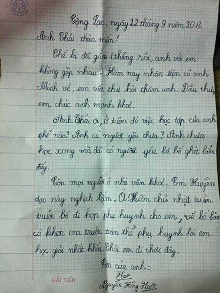 Bức thư này do em Nguyễn Hồng Hà, học lớp 3 gửi anh trai tên Thái đang học xa nhà. Cô bé này hiện đang ở xã Cộng Lạc, huyện Tứ Kỳ, tỉnh Hải Dương.