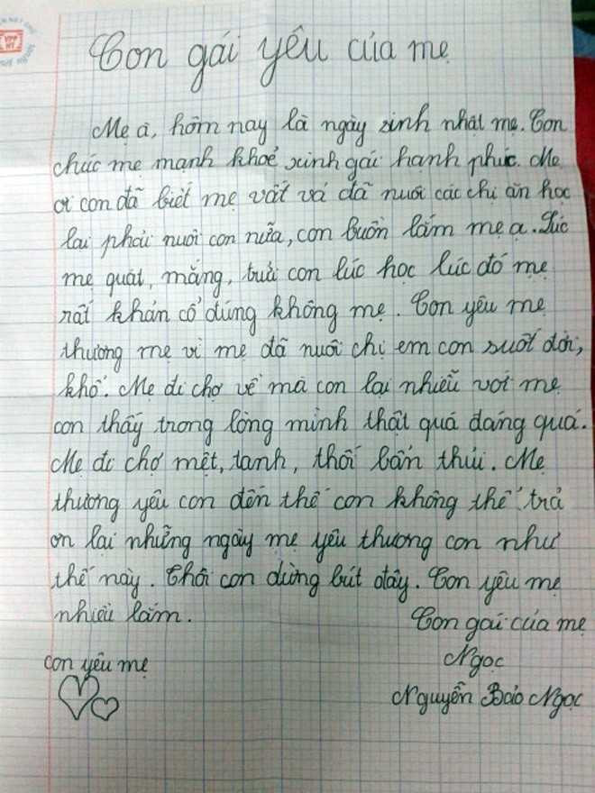 Một bức thư ngắn gửi mẹ nhân ngày sinh nhật của một cô bé lớp 4 với những ngôn ngữ giản dị, còn lỗi chính tả nhưng đã khiến rất nhiều người xúc động.