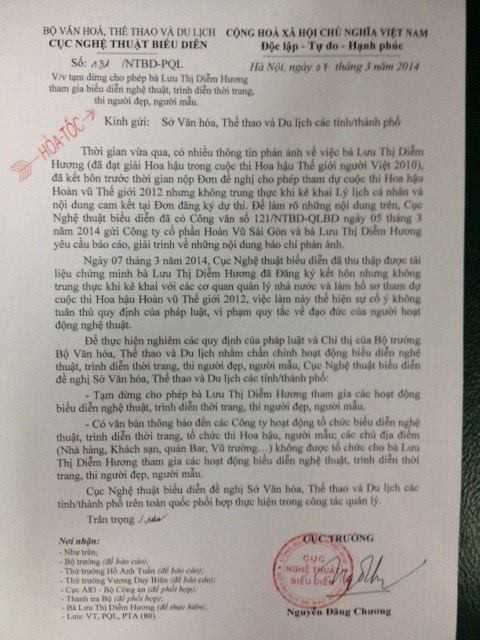 - Có văn bản thông báo đến các Công ty hoạt động tổ chức biểu diễn nghệ thuật, trình diễn thời trang, tổ chức thi Hoa hậu, người mẫu, các chủ địa điểm (Nhà hàng, Khách sạn, quán Bar, Vũ trường…) không được tổ chức cho bà Lưu Thị Diễm Hương tham gia các hoạt động biểu diễn nghệ thuật, trình diễn thời trang, thi người đẹp, người mẫu.