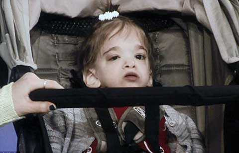 Cô không biết nói, vẫn mang hàm răng sữa của những em bé và mọi di chuyển của cô đều nhờ vào chiếc xe đẩy dành cho trẻ sơ sinh.