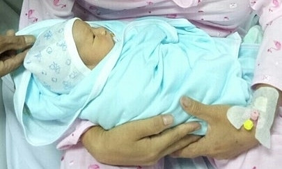 Sản phụ V.T.V. hạnh phúc ôm đứa con vừa chào đời.