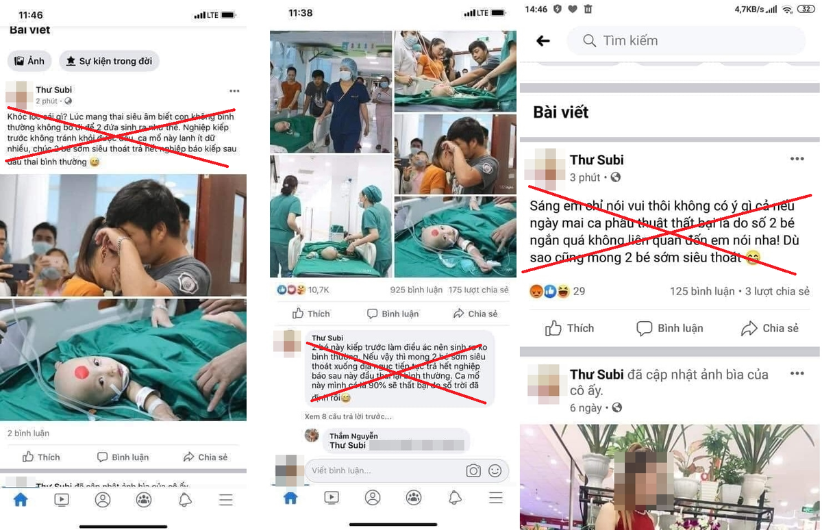 Tôi thấy lạnh sống lưng khi đọc những dòng đó. Con sinh ra bị dính liền, phải trải qua ca đại phẫu phức tạp, đau đớn mới có cơ hội phát triển bình thường, đối với người làm cha làm mẹ đã là điều đau khổ lớn rồi. Vậy mà cô gái này nỡ khoét sâu thêm vết thương tinh thần đó bằng những lời cay nghiệt, tàn nhẫn đến vậy. Nếu không phải có vấn đề về thần kinh, trí tuệ thì người viết ra những dòng này chắc cũng có tâm hồn đen tối, hoàn toàn không có khả năng thấu cảm với nỗi đau của người khác.