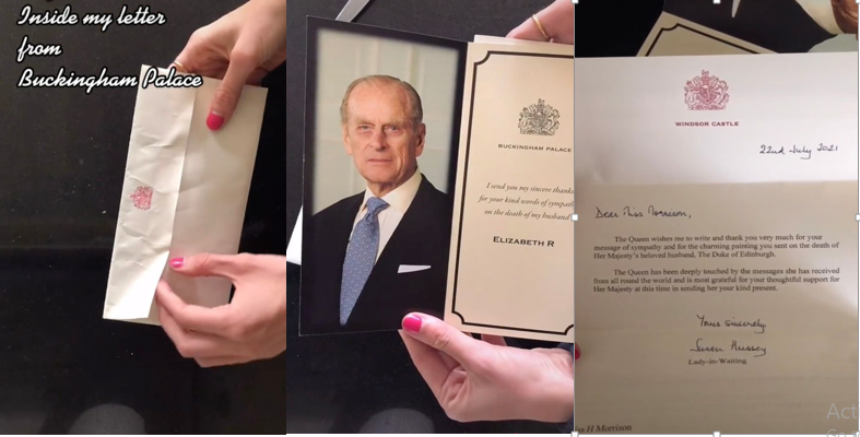 Trong video được đăng vào Chủ nhật (25/7), Honor Morrison mở lá thư và nhận được một tấm thiệp cảm ơn có in hình Hoàng thân Philip kèm bức thư có lời nhắn của Nữ hoàng: "Tôi gửi đến bạn lời cảm ơn chân thành vì những lời chia sẻ đầy cảm thông của bạn đối với sự ra đi của chồng tôi. Elizabeth II”.