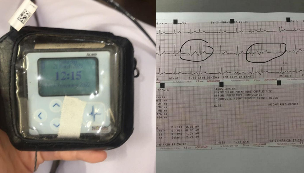 Dưới bài là điện tim của mình đấy, mấy cái khoanh khoanh là bất thường vì có khoảng cách các nhịp không đều nhau, còn dòng tiếng Anh kia là kết quả. Nói chung mình bị ngoại tâm thu thất, rối loạn nhịp tim mức độ nặng. Mình phải đeo máy holter theo dõi nhịp tim suốt 24h đấy”.