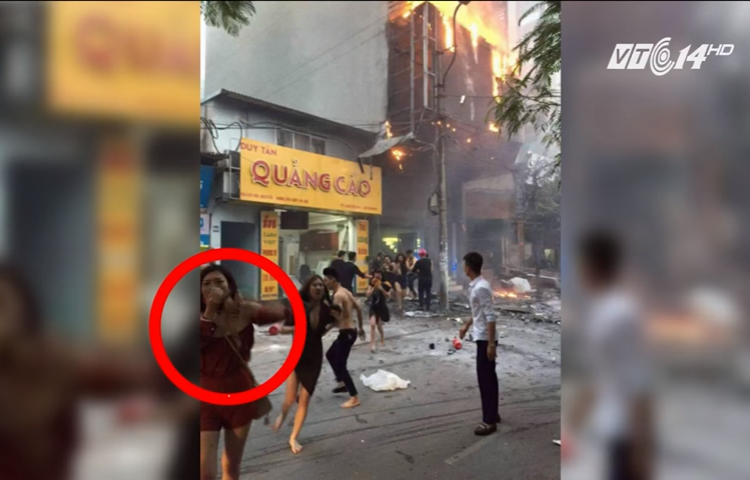 Vụ cháy quán karaoke trên đường Nguyễn Khang ngày 17/9 khiến mạng xã hội xôn xao vì bức ảnh một cô gái chạy ra khỏi đám cháy, trên tay cầm chiếc áo ngực của chính mình để bịt mũi, ngăn bị ngạt khói.
