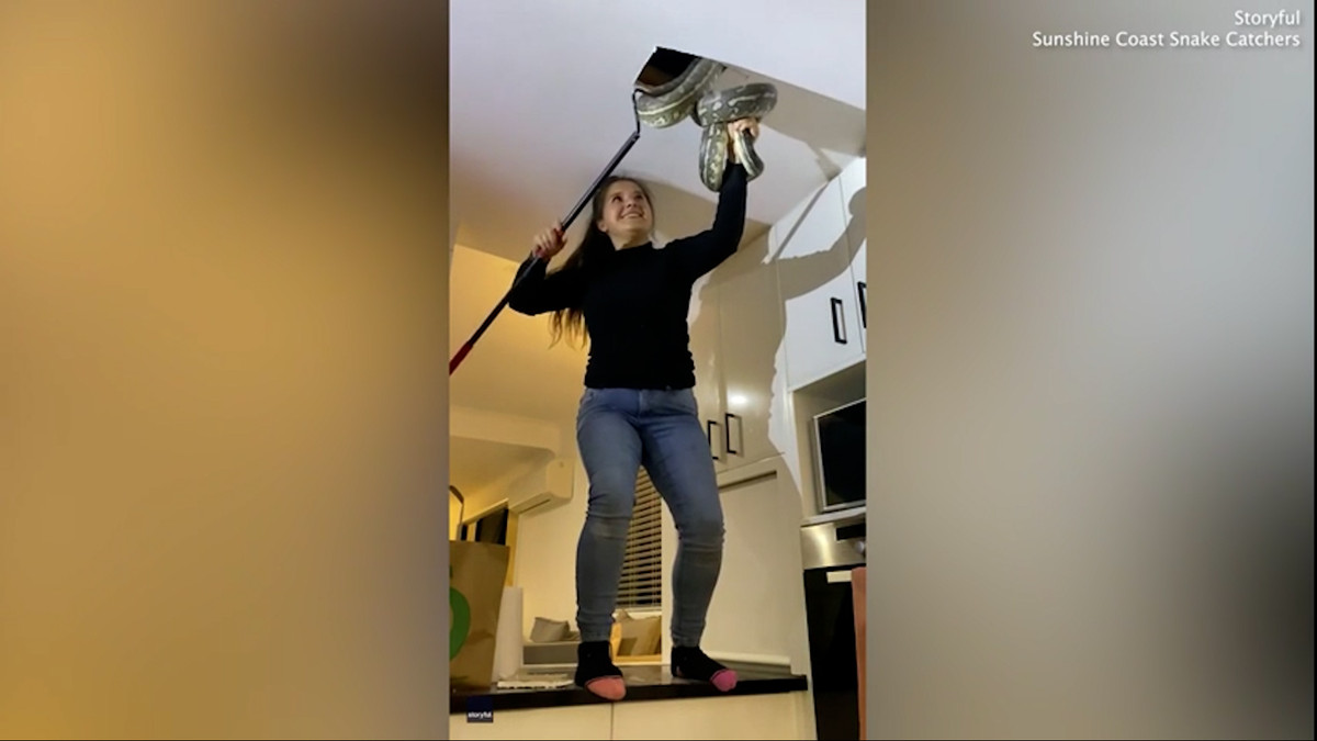 Cô gái thuộc đội bắt rắn chuyên nghiệp ở Australia đã đục một lỗ vuông trên trần nhà, sau đó nhẹ nhàng dùng tay không kéo 2 con trăn xuống đất.