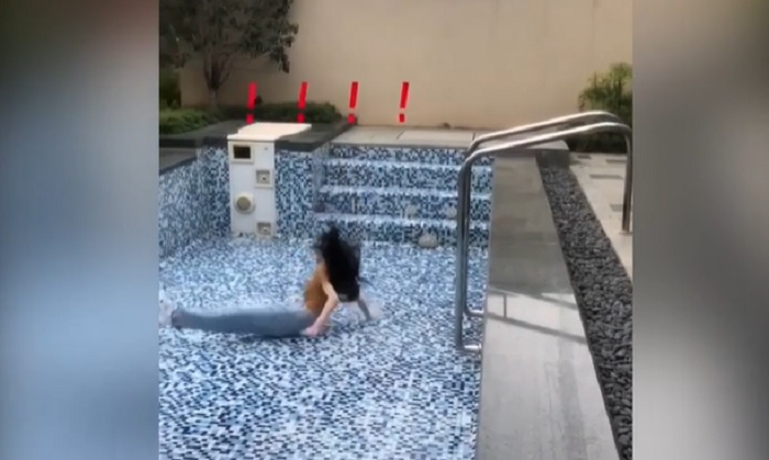 Cô gái ê ẩm vì nhảy xuống hồ bơi không có nước
