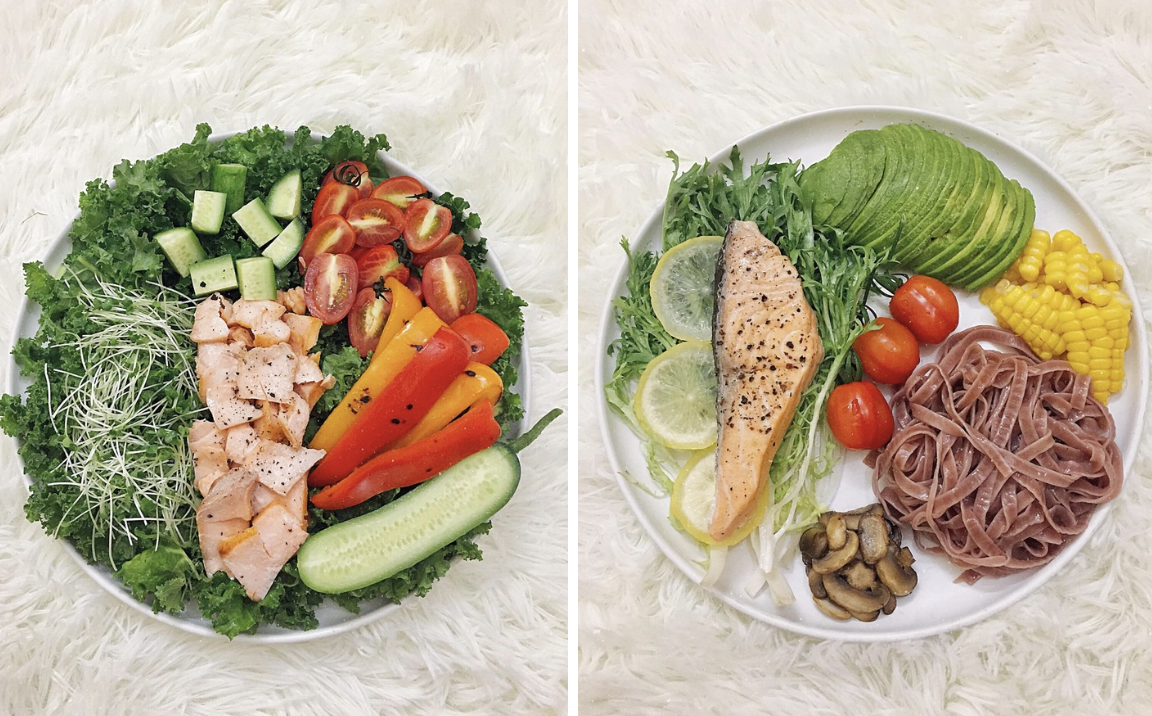 Cơm gạo lứt, cá hồi áp chảo, nnấm bào ngư áp chảo, cà rốt, đậu phụ luộc, xà lách.