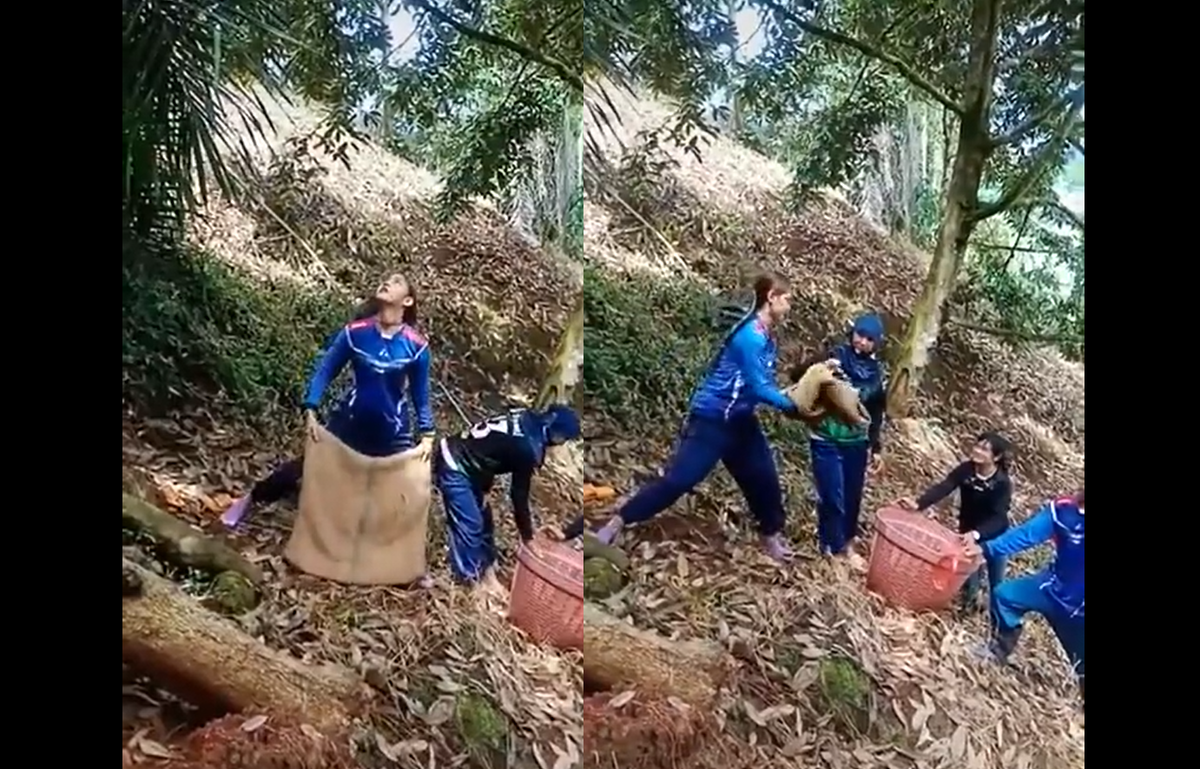 Những quả sầu riêng rơi từ trên cây xuống được cô gái hứng vào túi không trượt phát nào.