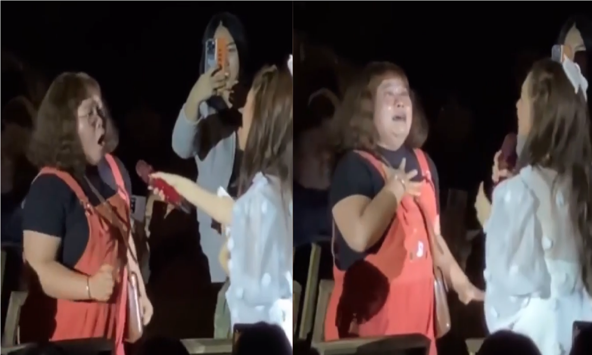 Đang phiêu với giai điệu của bài hát, cô gái giật nảy người khi nghe giọng hát của chính mình qua micro.