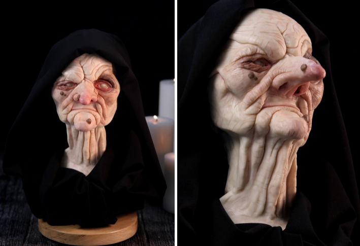 Cô dùng bút đi màu từng nếp nhăn, tạo chiều sâu cho gương mặt mụ phù thủy, tô các nốt đồi mồi và chấm từng đốm tàn nhang.