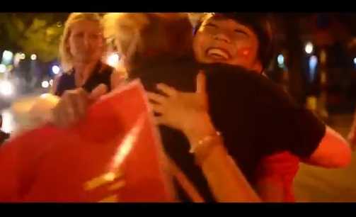 Một cô gái cầm trên tay tấm biển bằng tiếng Anh với nội dung “Tôi là người Việt Nam. Tôi yêu hòa bình. Nếu bạn cũng vậy, xin hãy ôm tôi” đi khắp phố phường.