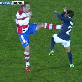 (VTC News)-Cố gắng rướn người lấy bóng cho đồng đội, Buonanotte (Malaga) ăn ngay một cú kungfu từ Borja Gomez (Granada).
