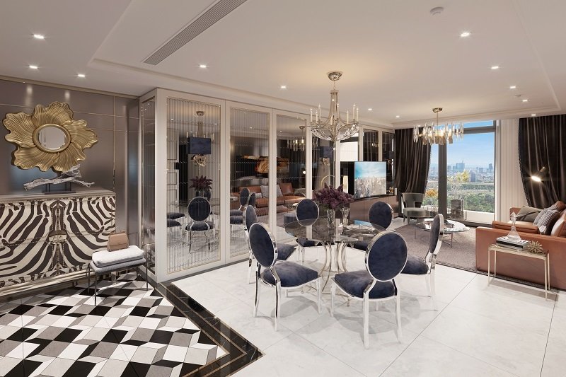 Trong khi đó, căn hộ 3 phòng ngủ với tầm nhìn hướng ra công viên Bách Thảo được phối cảnh bài trí với tên gọi “Luxury”. Những chi tiết trang trí nổi bật từ chất liệu mạ kim, pha lê khéo léo “khoe” không gian lấp lánh nhờ ánh sáng tự nhiên và hệ thống đèn tinh xảo.