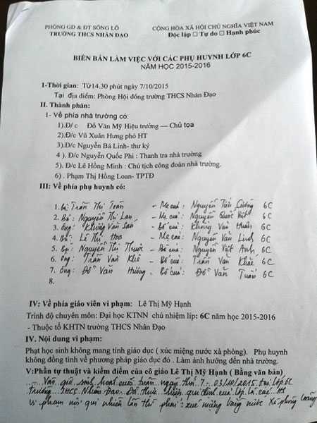 | Biên bản làm việc giữa lãnh đạo THCS Nhân Đạo với 7 phụ huynh có con bị phạt xúc miệng bằng xà phòng |