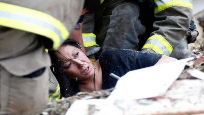 Một ngày sau khi lốc xoáy tàn phá nhiều ngôi nhà và cướp đi sinh mạng hàng chục người ở thị trấn Moore, Oklahoma, các nhân viên cứu hộ tìm thấy một phụ nữ trong đống đổ nát ở Trường tiểu học Plaza Towers, một trong những trường học bị phá hủy đầu tiên bởi cơn lốc xoáy hung hãn.