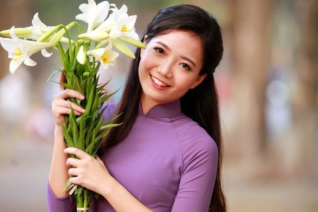 Đã có rất nhiều kỉ niệm gắn với mảnh đất Thủ đô, cô giáo Phan Hồng Anh lựa chọn tà áo dài sắc tím mộng mơ, khoe nét duyên dáng cùng loài hoa loa kèn thanh nhã.