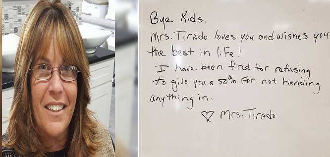 Vào ngày cuối cùng, Tirado để lại lời nhắn trên bảng trắng cho các học sinh: "Tạm biệt các em. Cô Tirado yêu các em và chúc các em những điều tốt nhất trong cuộc sống! Cô đã bị sa thải vì từ chối chấm 50% tổng điểm cho những em không hề nộp bài".