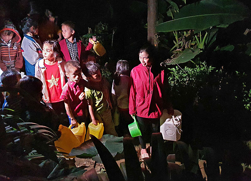 Hàng ngày, ngoài thời gian lên lớp các thầy, cô giáo và các em học sinh trong trường còn phải thay nhau đi xách từng xô nước trong khe núi cách trường gần 1km để lấy nước, nấu ăn và sinh hoạt.