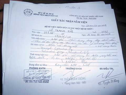 | Giấy xác nhận thương tích anh Lê Thanh Hải tại bệnh viện 115. Ảnh: Phan Cường |