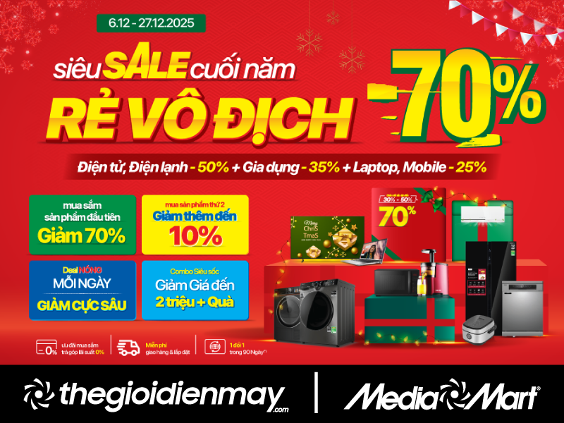 Để đáp ứng tối đa nhu cầu của người tiêu dùng, Hệ thống siêu thị điện máy MediaMart khai màn chương trình “Siêu Sale Cuối Năm – Rẻ Vô Địch” kéo dài từ ngày 6/12 đến 27/12/2025.