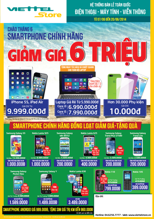 Quý khách hãy nhanh chân đến cửa hàng, siêu thị Viettel để mua ngay sản phẩm chính hãng và nhận được những ưu đãi hấp dẫn. Để biết thông tin chi tiết về chương trình, khách hàng vui lòng truy cập website http://viettelstore.vn/Home/Khuyen-mai/Khuyen-mai-chung/ hoặc vui lòng liên hệ số 046.256.7777 hoặc đến siêu thị, cửa hàng Viettel gần nhất.