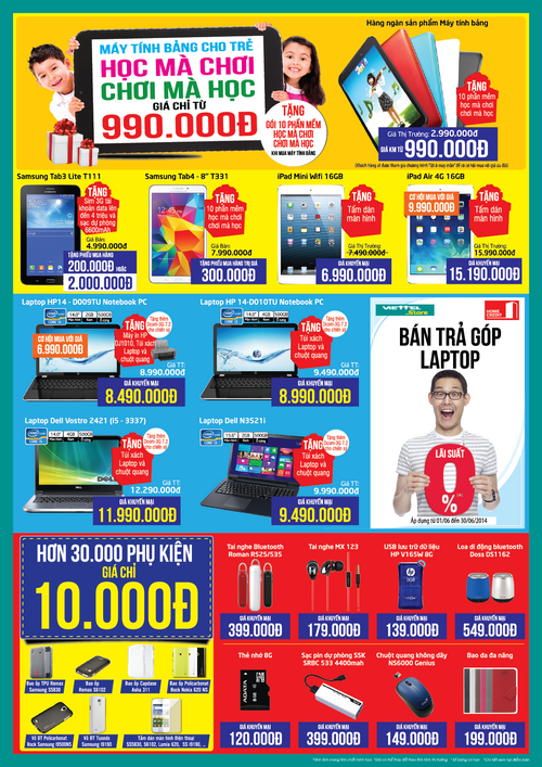 Chương trình được triển khai từ 7/6 đến 5/7/2014 cùng nhiều khuyến mãi hấp dẫn khác như: iPhone 5S/iPad Air giá chỉ từ 9.999.000 đồng, laptop giá rẻ từ 5.990.000 đồng tặng ba lô, chuột quang và tặng thêm usb 3G 7.2 cho chiến sỹ, hơn 30.000 phụ kiện giá chỉ 10.000 đồng....![]() |