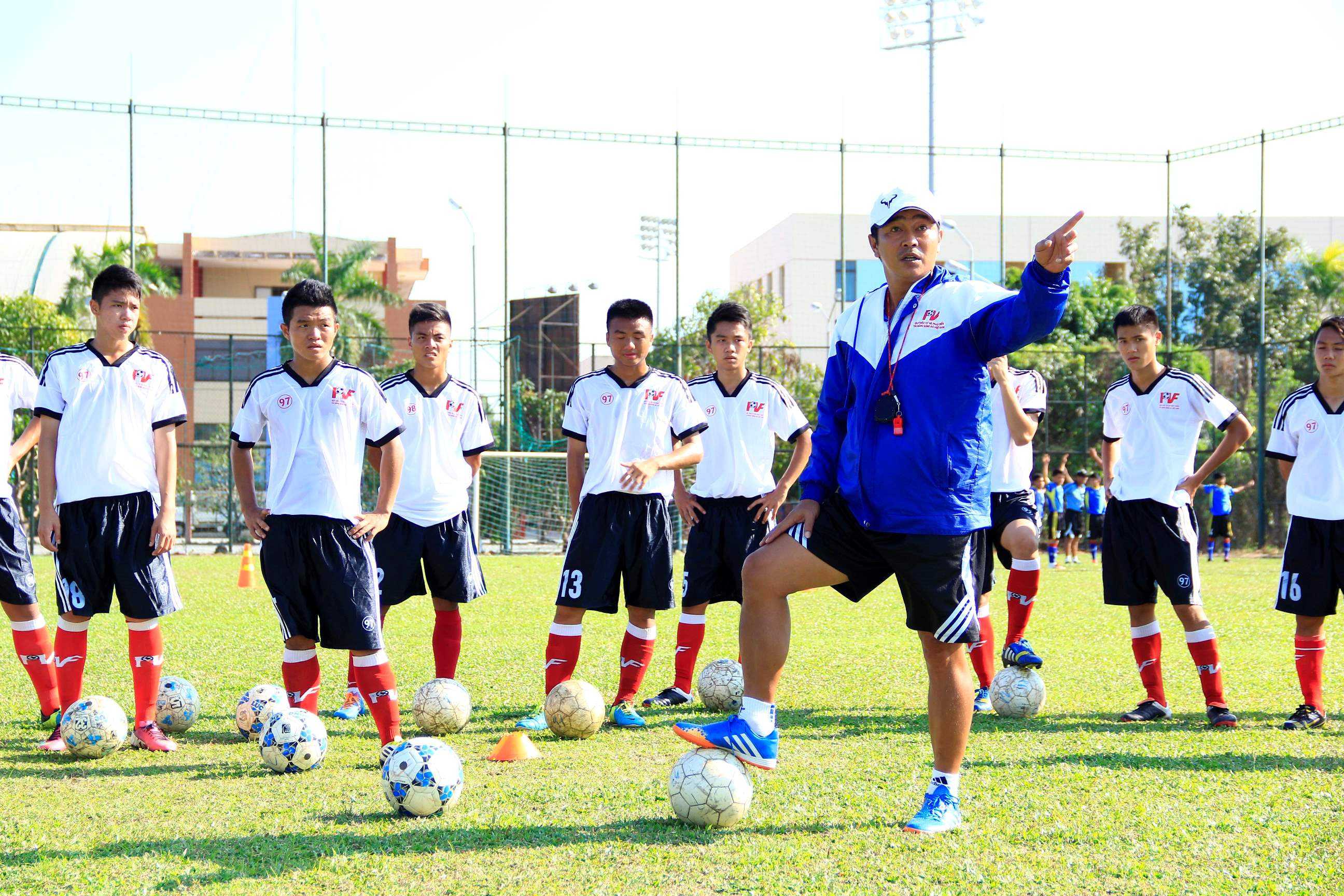HLV Nguyễn Mạnh Cường đang truyền đạt kinh nghiệm cho các cầu thủ trẻ PVF