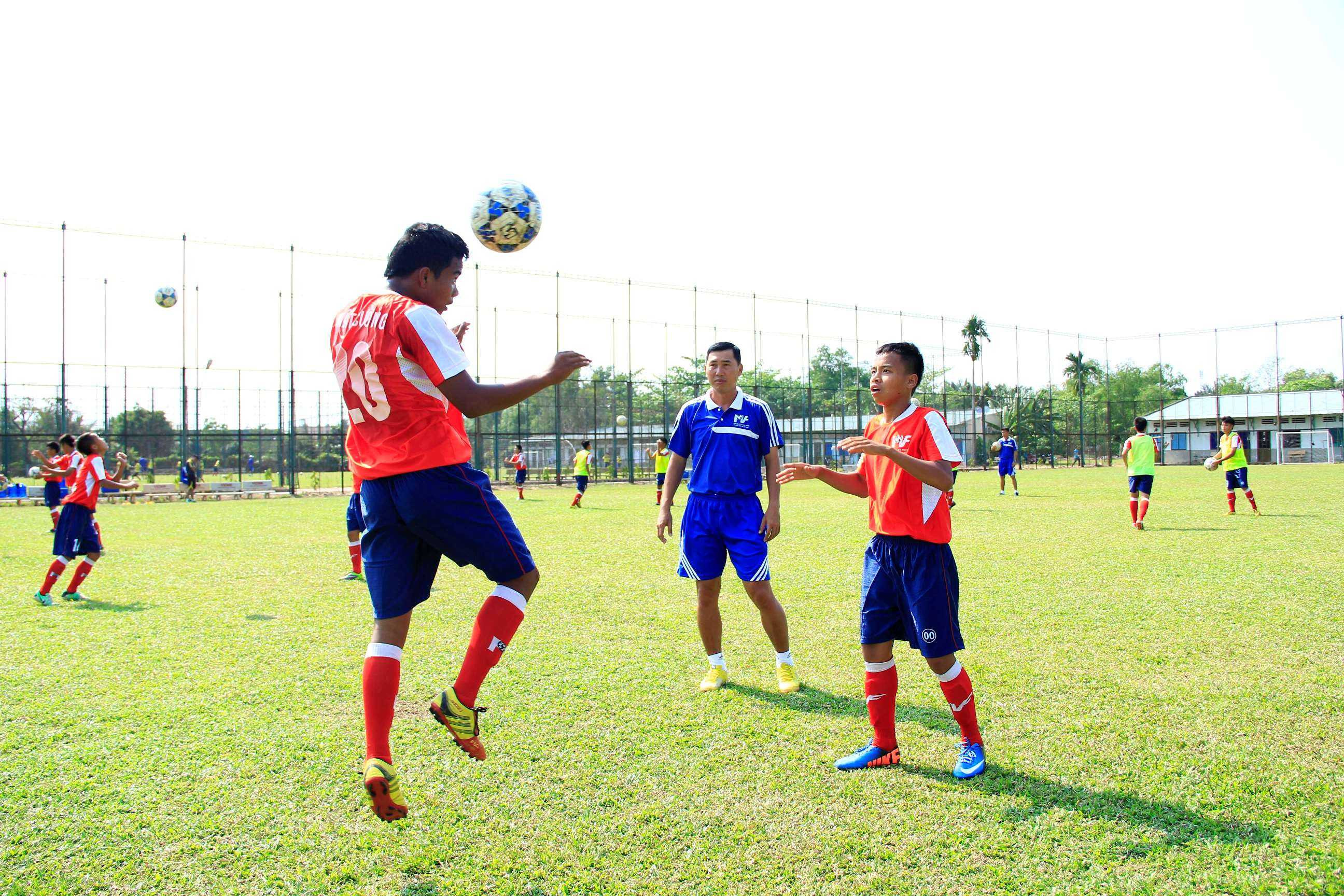 Huấn luyện viên Hứa Hiền Vinh đang hướng dẫn các cầu thủ kỹ năng chơi bóng bằng đầu.