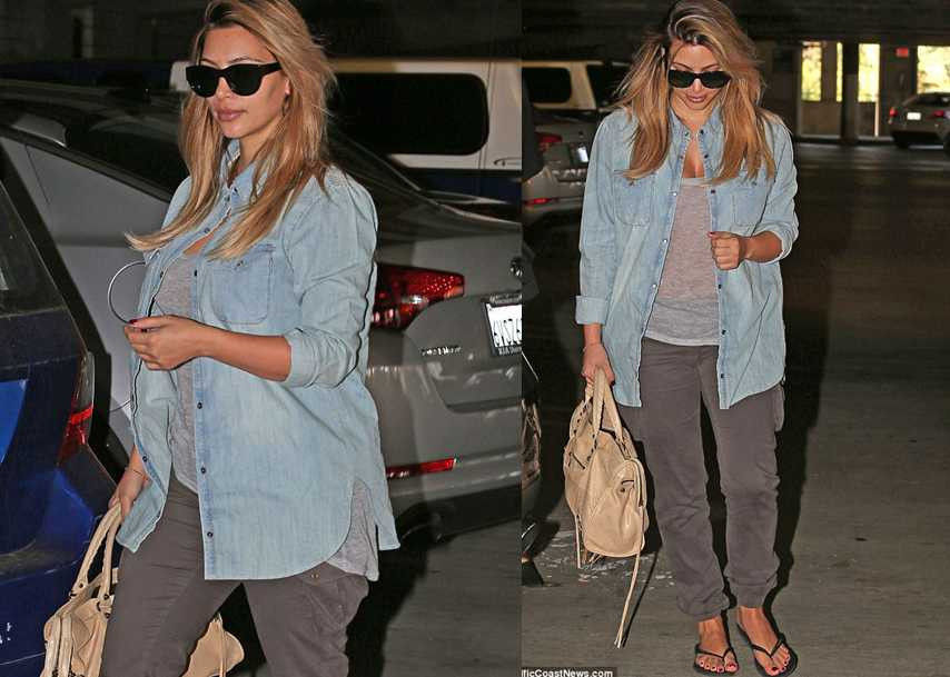 Kim Kardashian không hề trang điểm và giấu đi khuôn mặt mệt mỏi sau lớp kính đen. Kim mặc quần kaki rộng kết hợp với đôi tông bệt, chiếc áo phông màu xám, cuối cùng là khoác ngoài bằng chiếc áo bò lỗi mốt. Hình ảnh của Kim khác một trời một vực so với hình ảnh lung linh, sexy, quyến rũ trước đây cô luôn theo đuổi.