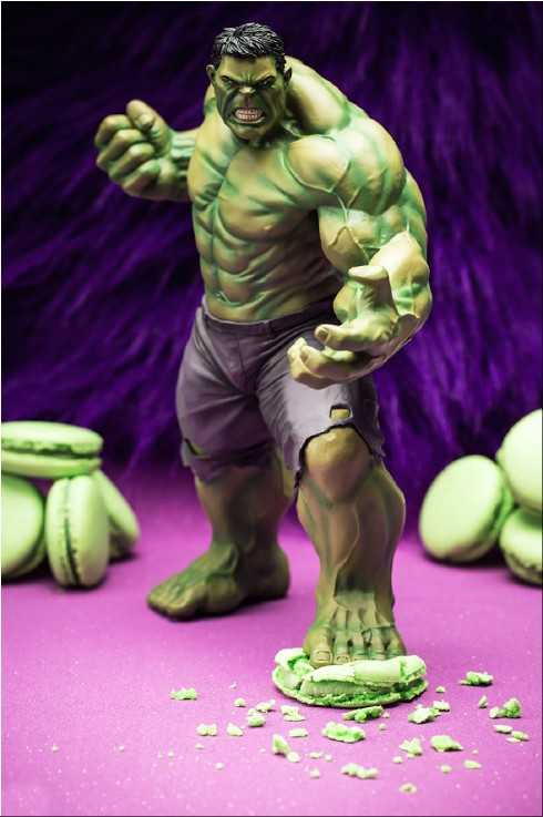 | Chiếc bánh Macaron nằm gọn dưới chân của chàng khổng lồ xanh. |