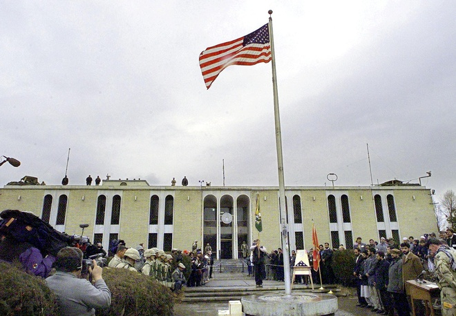 Quốc kỳ Mỹ tại lễ khai trương Đại sứ quán Mỹ ở thủ đô Kabul của Afghanistan vào ngày 17/12/2001. (Ảnh: AFP)