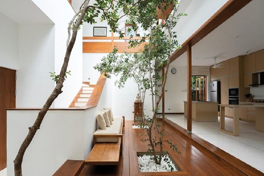 Nên chọn vật liệu kính cường lực cách nhiệt, lắp rèm tự động hoặc mái che di động. Trồng cây xanh dưới giếng trời cũng là cách giảm nhiệt và mang lại vẻ đẹp cho căn nhà.