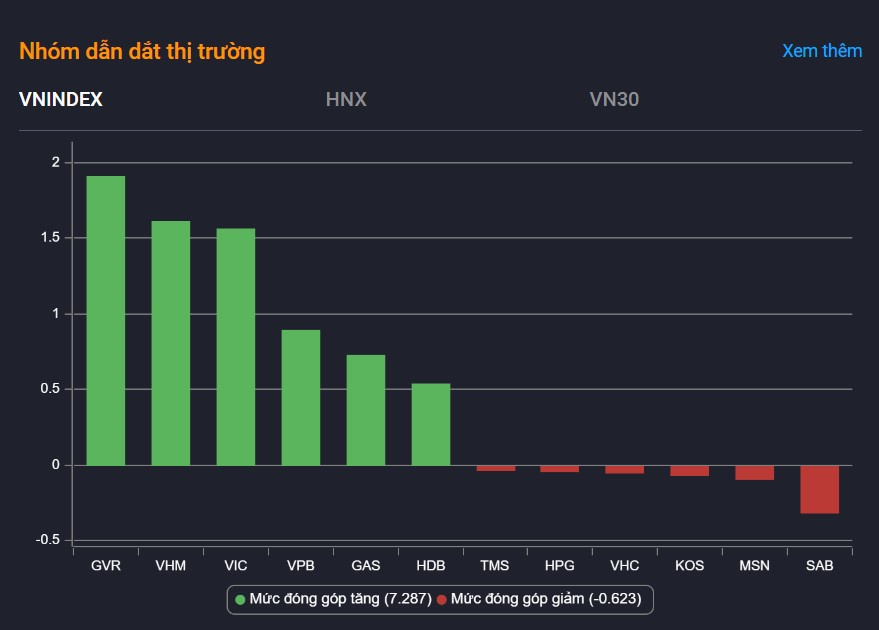 Các cổ phiếu vốn hóa lớn đóng góp quan trọng nhất giúp VN-Index vượt mốc 1.080 điểm hôm nay gồm GVR (Cao su Việt Nam), VHM (Vinhomes), VIC (Vingroup), VPB (VPBank), Gas (PV Gas) với mức tăng giá 2-7%.