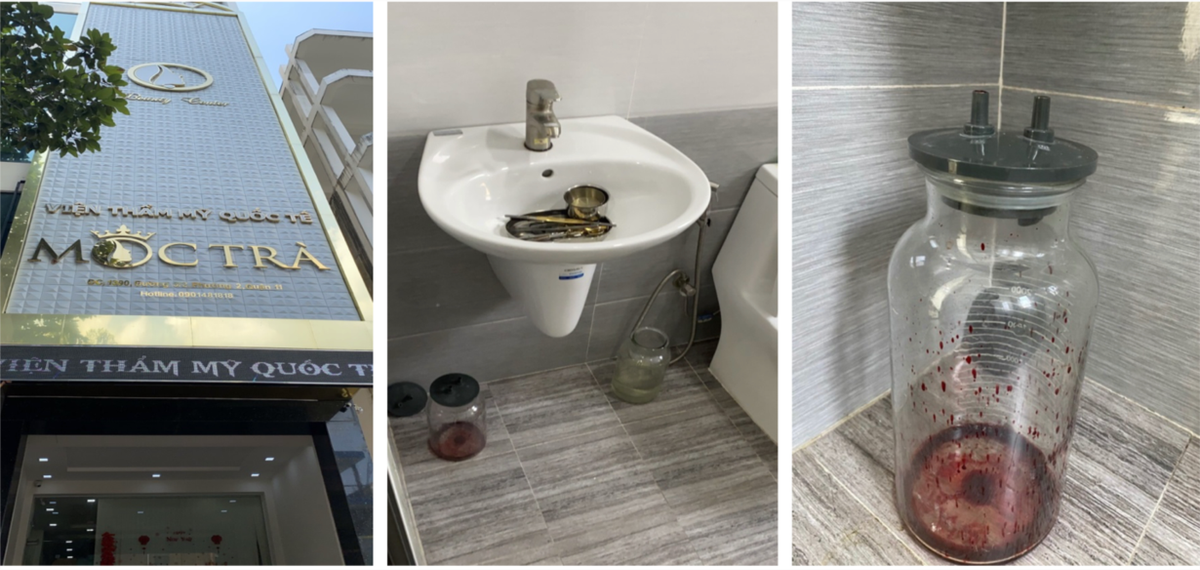 “Viện Thẩm mỹ Quốc tế Mộc Trà” - cơ sở chăm sóc da nhưng lại có các dụng cụ phẫu thuật, bình hút dịch có máu đỏ tươi (Ảnh: Sở Y tế TP.HCM).