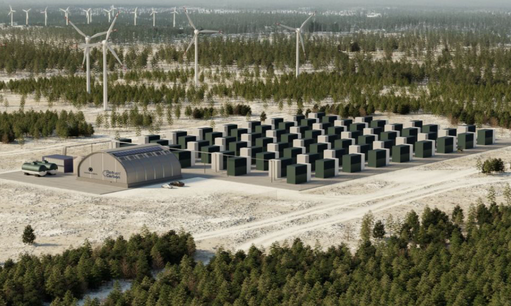 Thiết kế mô phỏng cơ sở thu giữ CO2 hoạt động bằng năng lượng gió. (Ảnh: Return Carbon)