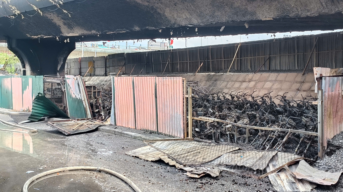 Ghi nhận tại hiện trường, hàng trăm xe máy bị thiêu rụi hoàn toàn. Dầm cầu bị khói ám đen, sức nóng của đám cháy khiến từng mảng bê tông dầm cầu Vĩnh Tuy bị bong tróc, trơ khung sắt.