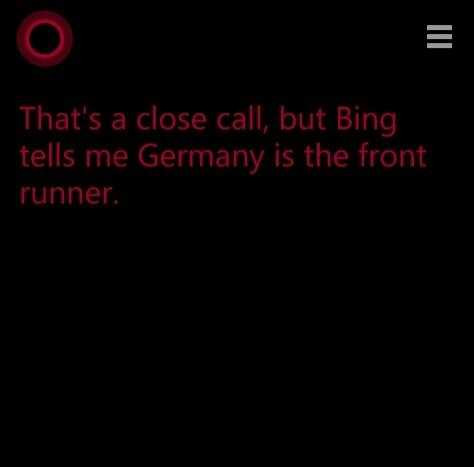 Trước trận chung kết, Cortana một lần nữa được những người hâm mộ đá bóng trao niềm tin khi hỏi về kết quả trận đấu sẽ diễn ra và Cortana khiến những ai yêu thích đội tuyển bóng đá Đức hài lòng và tràn đầy hy vọng khi dự đoán Đức sẽ vượt qua Argentina để đăng quang tại World Cup năm nay.