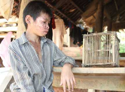 Nói rồi, anh Văn Anh dẫn tôi vào buồng trong của căn nhà sàn. Cửa vẫn đóng, màn vẫn buông. Trời nóng mà Hiệp vẫn đắp chăn bông. Thấy khách, Hiệp chui ra khỏi màn. Em ngồi bên bậu cửa, nhìn chúng tôi len lén, đôi tay cứ gãi xoành xoạch không ngừng.