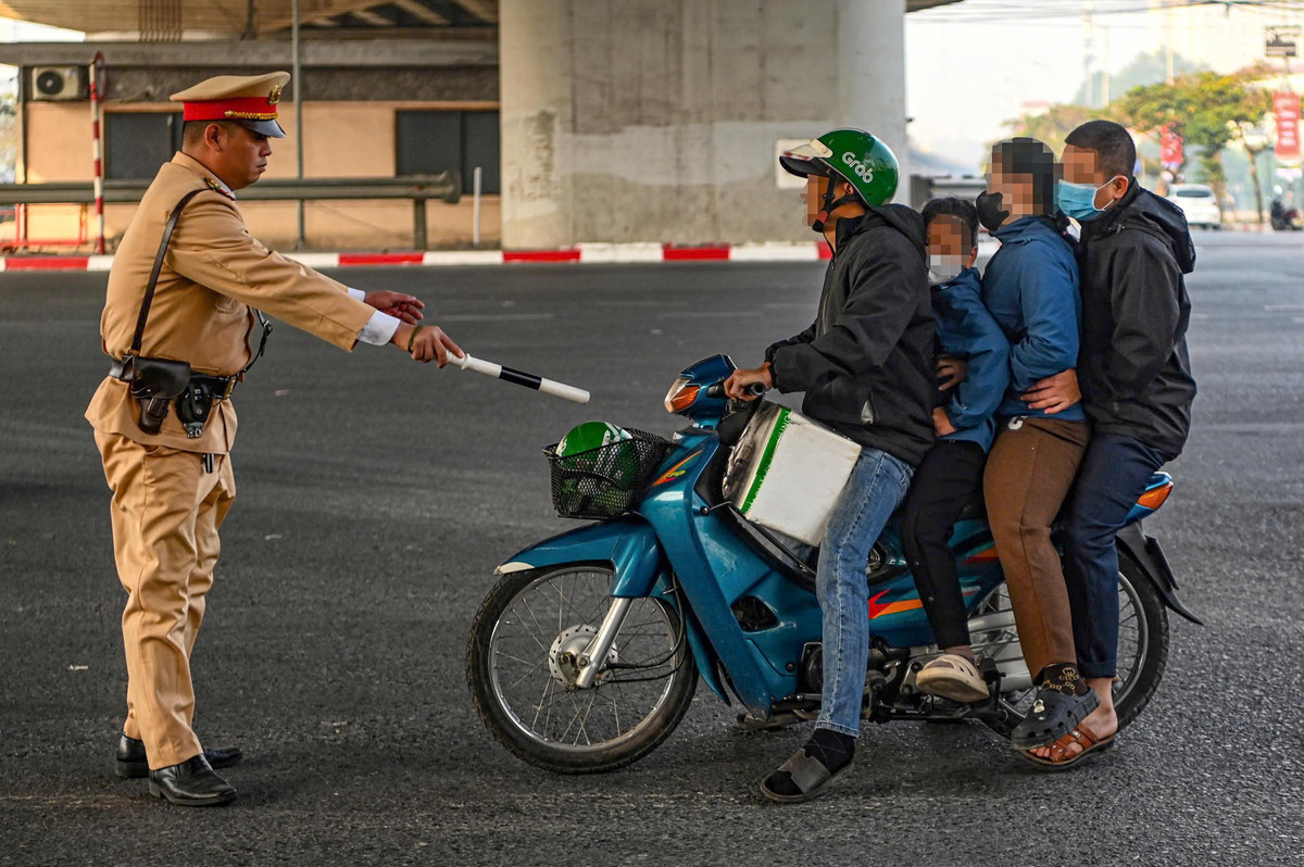 Cảnh sát giao thông Hà Nội xử phạt nhiều tài xế chở hàng cồng kềnh bằng xe máy sáng 1/1.