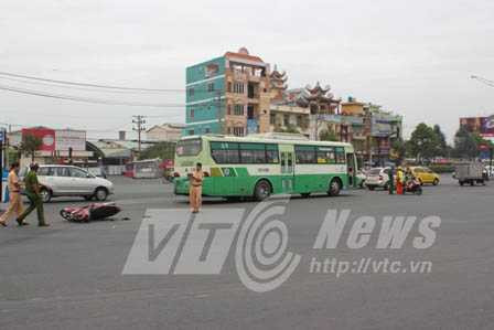 Tại hiện trường chiếc xe máy nằm xoay ngược theo chiều di chuyển nằm cách xe buýt gần 10 mét, chiếc xe buýt nằm ngay giữa giao lộ phần đầu xe móp méo, đèn xe bị vỡ vụn,