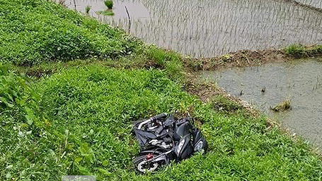 Xe máy bị tàu đâm bắn xuống ruộng cách đường tàu hàng chục mét.