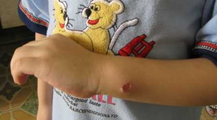 | Bọ xít hút máu đốt vào tay một cháu bé, gây ra vết thương hở |