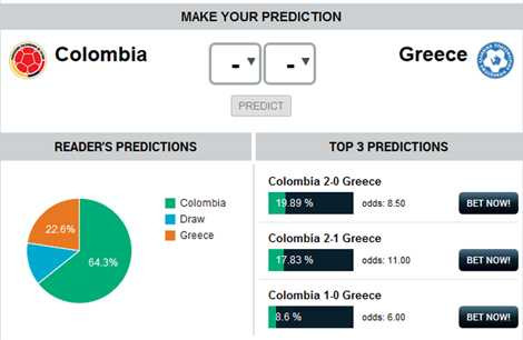 Hy Lạp đã có cơ hội rút ngắn tỷ số ở phút 62 nhưng Gekas trong thế trống trải lại đánh đầu đưa bóng dội xà ngang bật ra. Đó là tất cả những gì mà Hy Lạp làm được trước khi bị nhấm chìm bởi Jame Rodriguez ở phút 90+3.